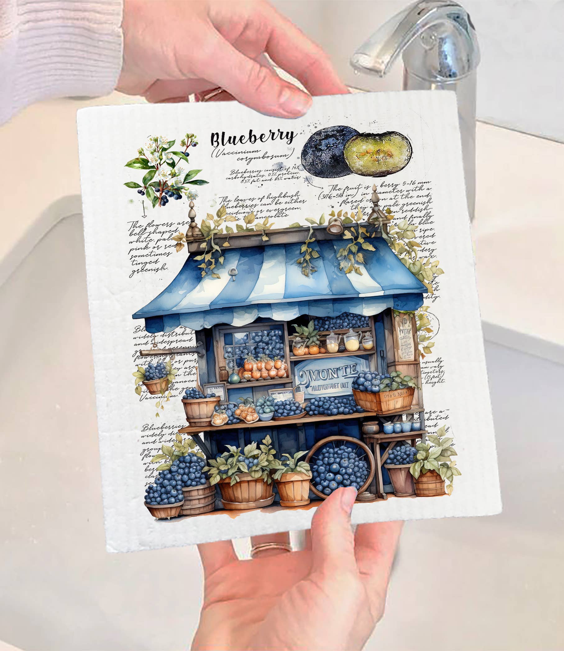 Set of 2 - Vintage Blueberry Fruit Cart Market SWEDISH DISH CLOTH