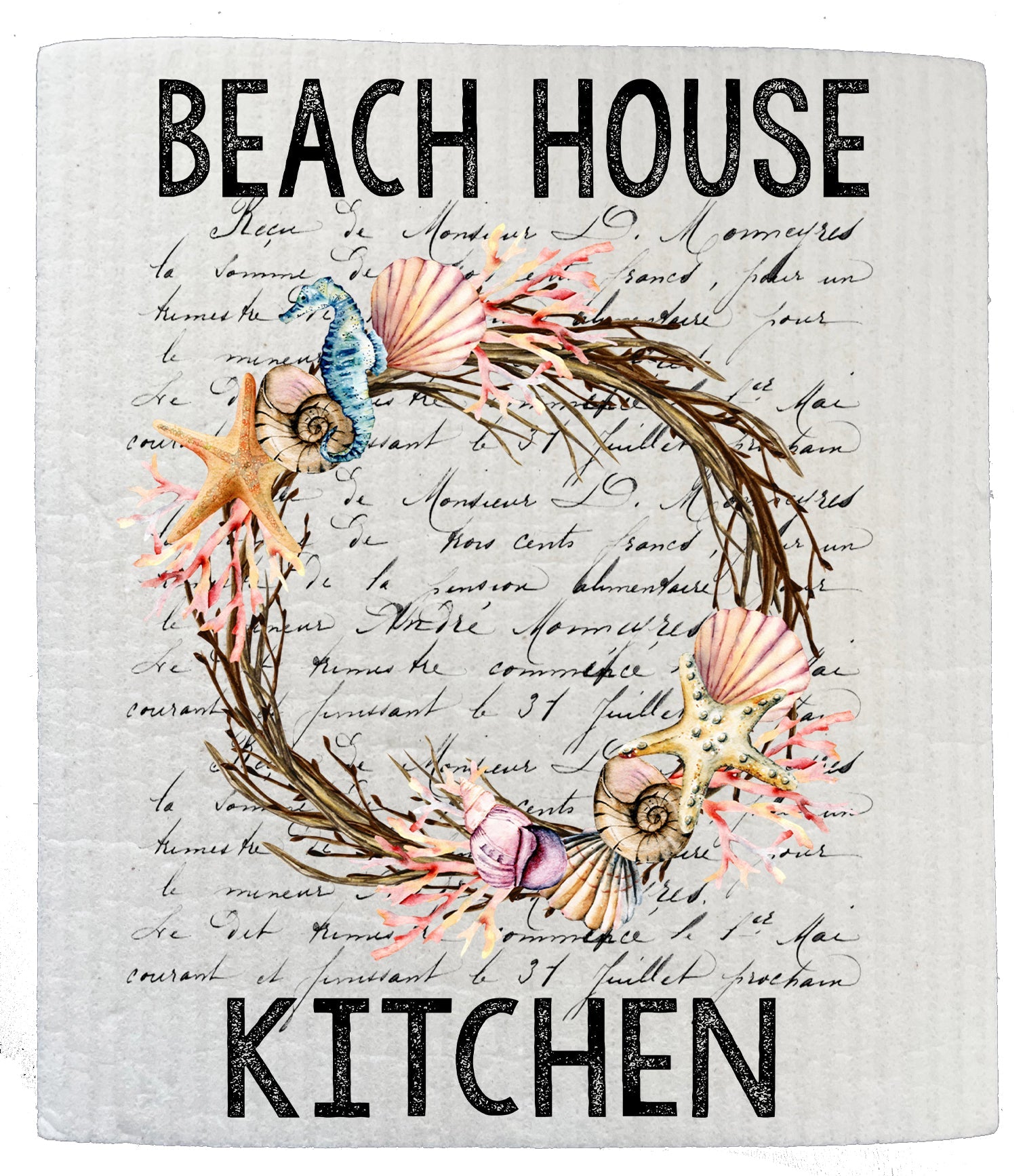 Set of 2 - Beach House Kitchen Sea Shells Wreath Ocean SWEDISH DISH CLOTH