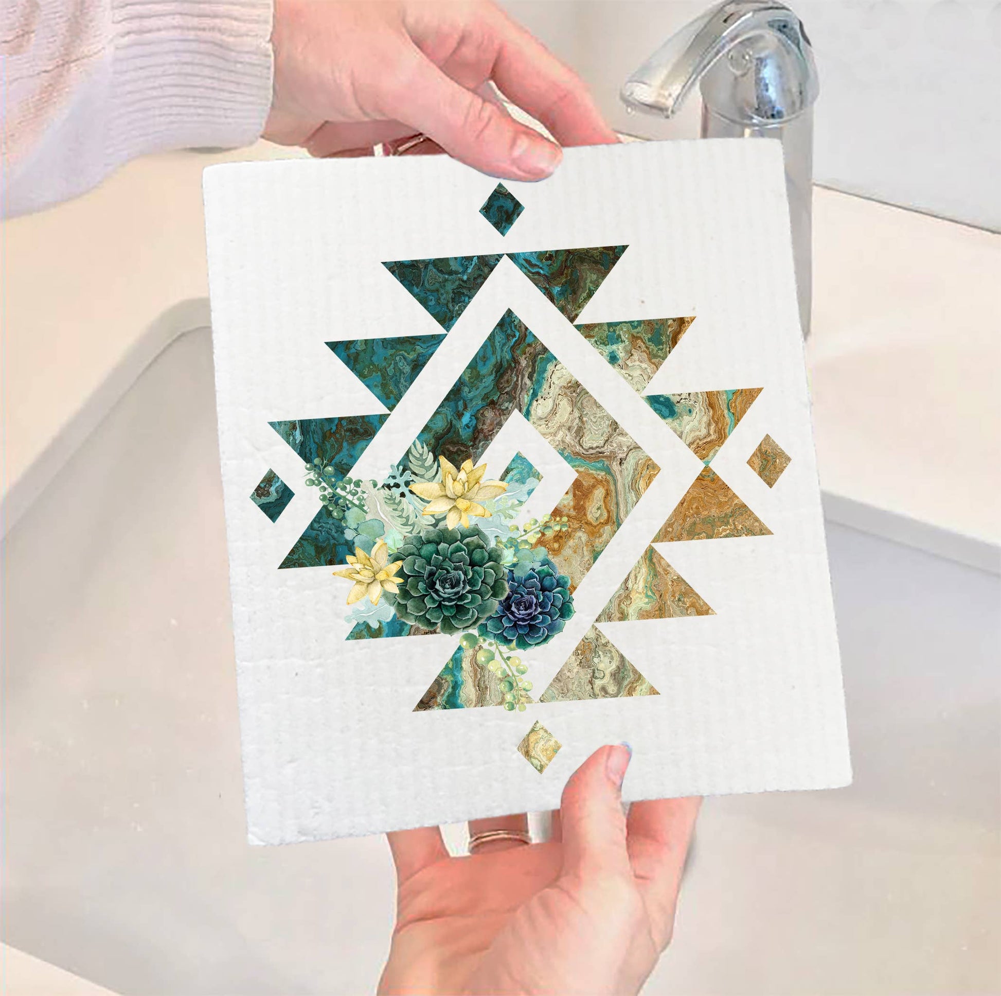 Set of 2 - Western Blue Aztec Cactus Southwestern SWEDISH DISH CLOTH